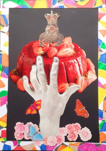 Outsiderart; Collage nr.1274; Stay alert, calm and proud on your strawberry mountain in the shadow of a destructive corner.
